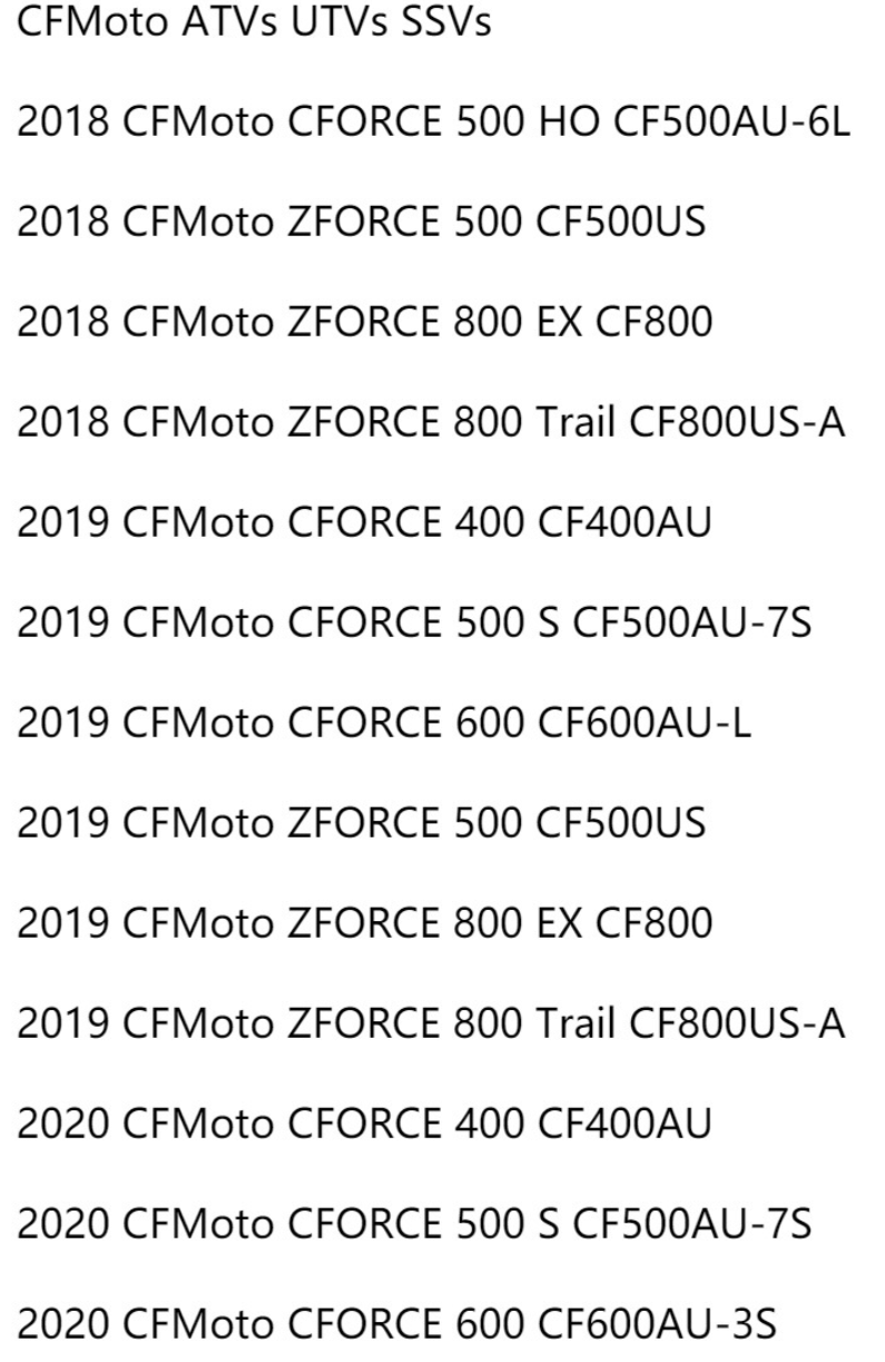 CF Moto 800cc listed part number is 805A-120004It may fits2011 CFMoto RANCHER 600 UTV - FUEL TANK2011 CFMoto RANCHER 600 UTV - FUEL TANK2011 CFMoto Z6 UTV - FUEL TANK2011 CFMoto Z6 UTV - FUEL TANK2012 CFMoto RANCHER 600 UTV - FUEL TANK2012 CFMoto RANCHER 600 UTV - FUEL TANK2012 CFMoto X5 LongWB (EFI) ATV - FUEL TANK2012 CFMoto X5 LongWB (EFI) ATV - FUEL TANK2012 CFMoto X5 LongWB (EFI) ATV - FUEL TANK2012 CFMoto X8 TerraLander ATV - FUEL TANK (METAL)2012 CFMoto X8 TerraLander ATV - FUEL TANK (METAL)2012 CFMoto X8 TerraLander ATV - FUEL TANK (PLASTIC)2012 CFMoto X8 TerraLander ATV - FUEL TANK (PLASTIC)2012 CFMoto Z6 UTV - FUEL TANK2012 CFMoto Z6 UTV - FUEL TANK2012 CFMoto Z6EX Sport UTV - FUEL TANK2012 CFMoto Z6EX Sport UTV - FUEL TANK2013 CFMoto Rancher 600 (CF600-5) - FUEL TANK2013 CFMoto Rancher 600 (CF600-5) - FUEL TANK2013 CFMoto X5 LWB X-Lander (efi) ATV - FUEL TANK2013 CFMoto X5 LWB X-Lander (efi) ATV - FUEL TANK2013 CFMoto X6 LWB X-Lander (efi) ATV - FUEL TANK2013 CFMoto X6 LWB X-Lander (efi) ATV - FUEL TANK2013 CFMoto X8 800 ATV - FUEL TANK (METAL)2013 CFMoto X8 800 ATV - FUEL TANK (METAL)2013 CFMoto X8 800 ATV - FUEL TANK (PLASTIC)2013 CFMoto X8 800 ATV - FUEL TANK (PLASTIC)2013 CFMoto Z6 Sport UTV - FUEL TANK2013 CFMoto Z6 Sport UTV - FUEL TANK2013 CFMoto Z6EX Sport UTV - FUEL TANK2013 CFMoto Z6EX Sport UTV - FUEL TANK2014 CFMoto Rancher 600 (UFORCE) - FUEL TANK2014 CFMoto Rancher 600 (UFORCE) - FUEL TANK2014 CFMoto X5LWB EFI (Double Seat) - FUEL TANK2014 CFMoto X5LWB EFI (Double Seat) - FUEL TANK2014 CFMoto X5SWB EFI (Single Seat) - FUEL TANK2014 CFMoto X5SWB EFI (Single Seat) - FUEL TANK2014 CFMoto X6LWB EFI (Double Seat) - FUEL TANK2014 CFMoto X6LWB EFI (Double Seat) - FUEL TANK2014 CFMoto X6SWB EFI (Single Seat) - FUEL TANK2014 CFMoto X6SWB EFI (